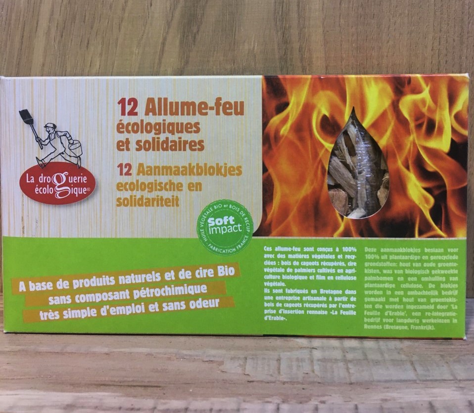 Ces allume-feu sont conçus à 100% avec des matières végétales et recyclées : bois de cageots récupérés, cire végétale et film en cellulose végétale.