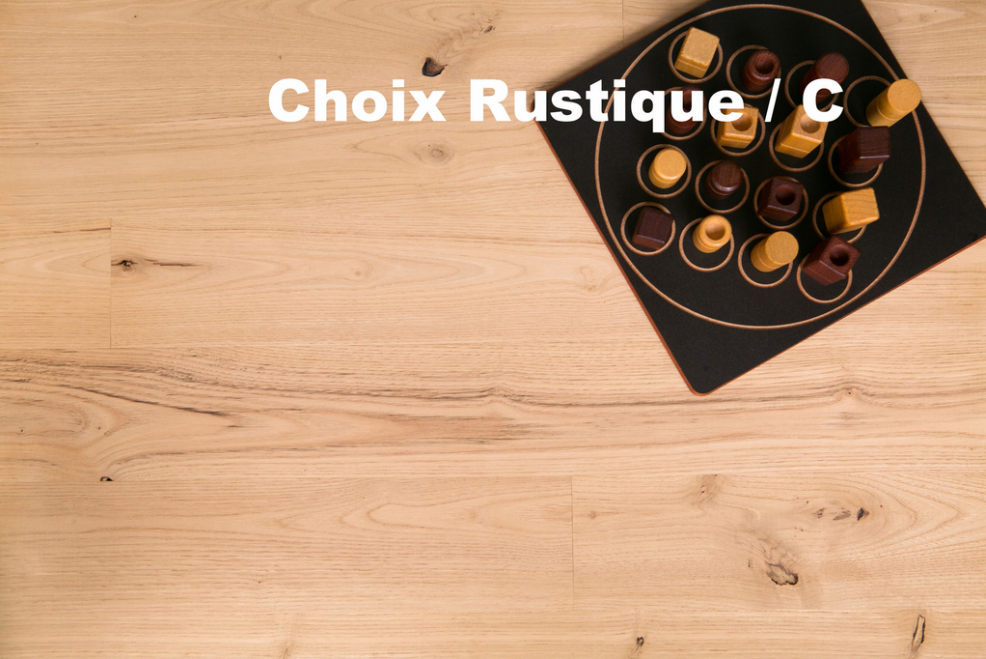 Choix rustique : en plus des défauts du choix AB, noeuds sains sans limitation de nombre et de diamètre. Noeuds noirs non décollés, mastiqués sans limitation. Noeuds sur rive tolérés avec un diamètre inférieur ou égal à 5 mm. Jaune sans limitation.